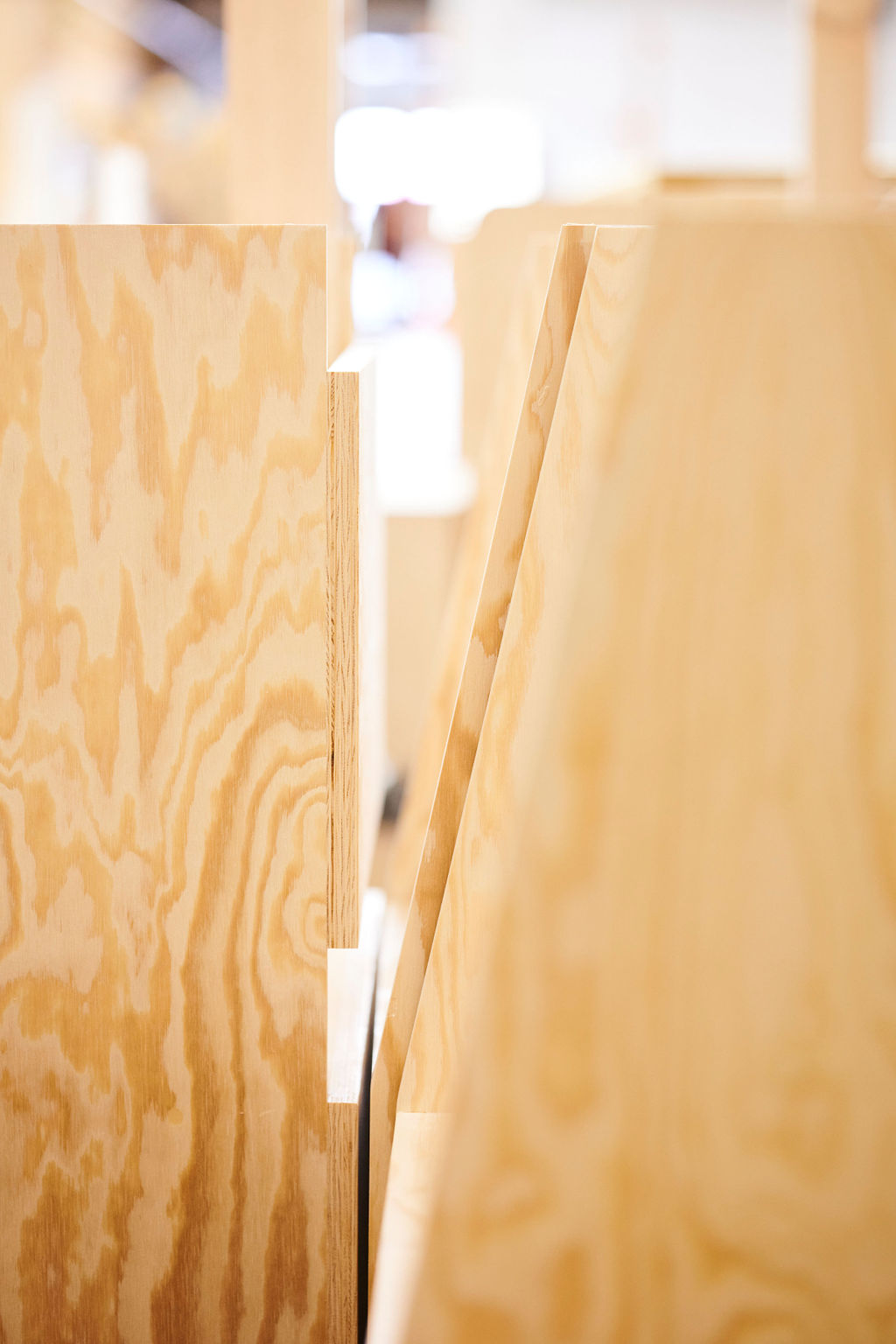 Following the same reuse logic, the reception desk was built using old gas pipes recovered from the construction site. Carefully selected, then painted or varnished, they were integrated into a wooden structure provided by Timber. Specializing in the revalorization of CLT panel offcuts, Timber operates within a circular and local approach.