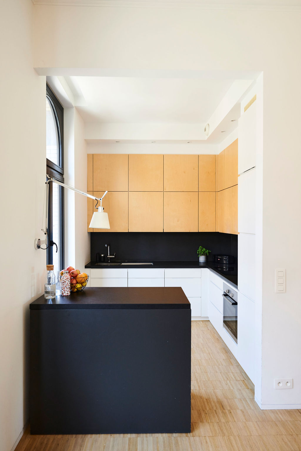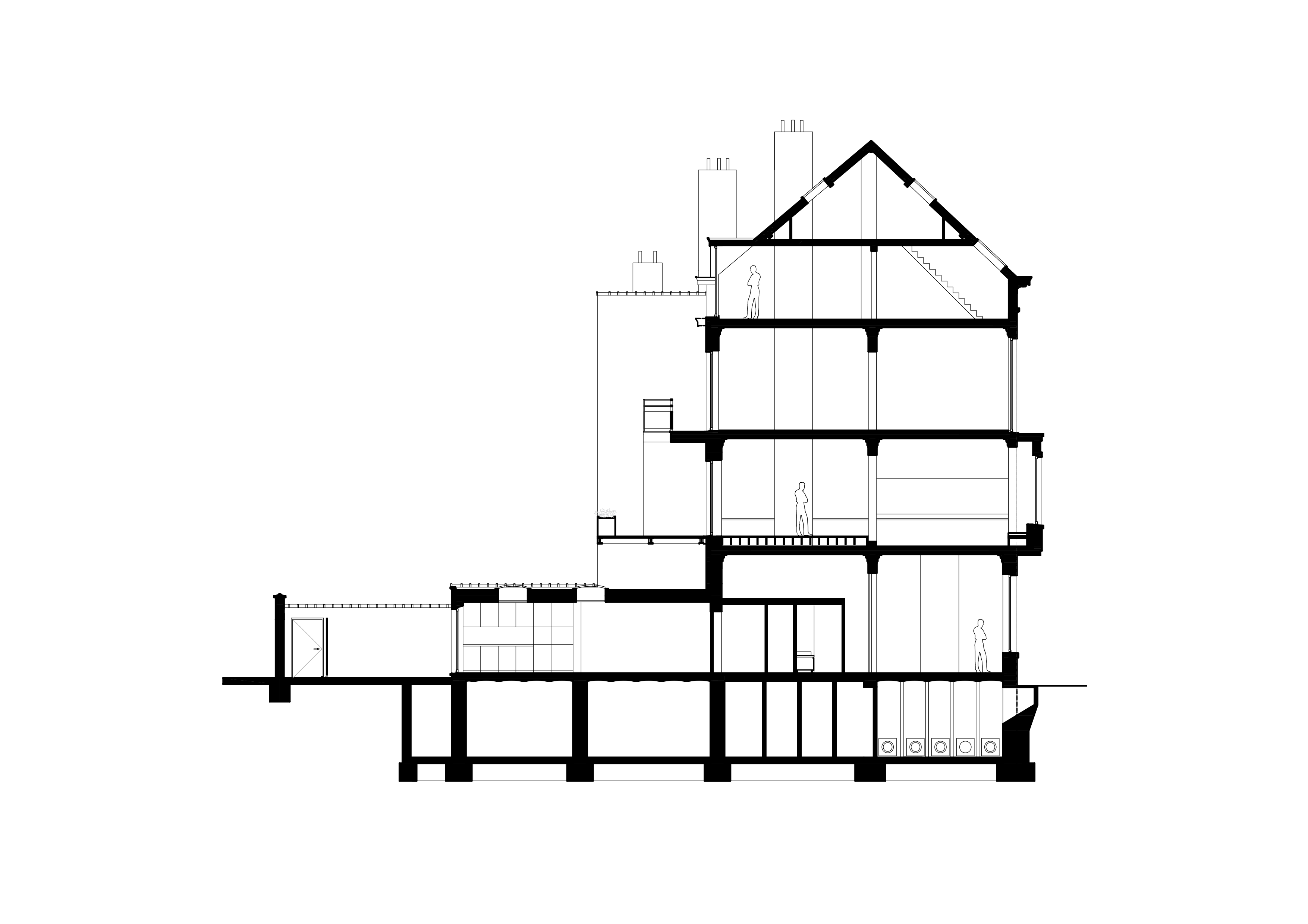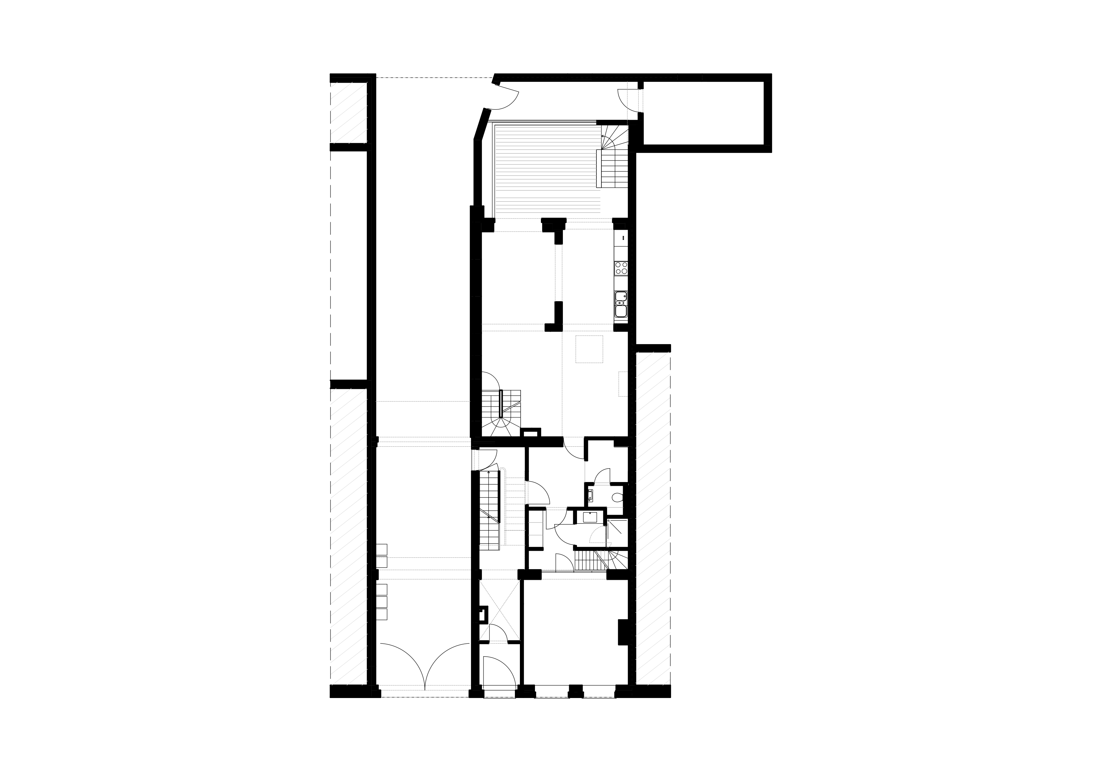 The project reorganizes the interior spaces, renovating the existing apartments and creating two new units in the attic. A bicycle and stroller storage area is set up at the back of the property, while the shared basement spaces include a laundry room, boiler room, and private cellars.
