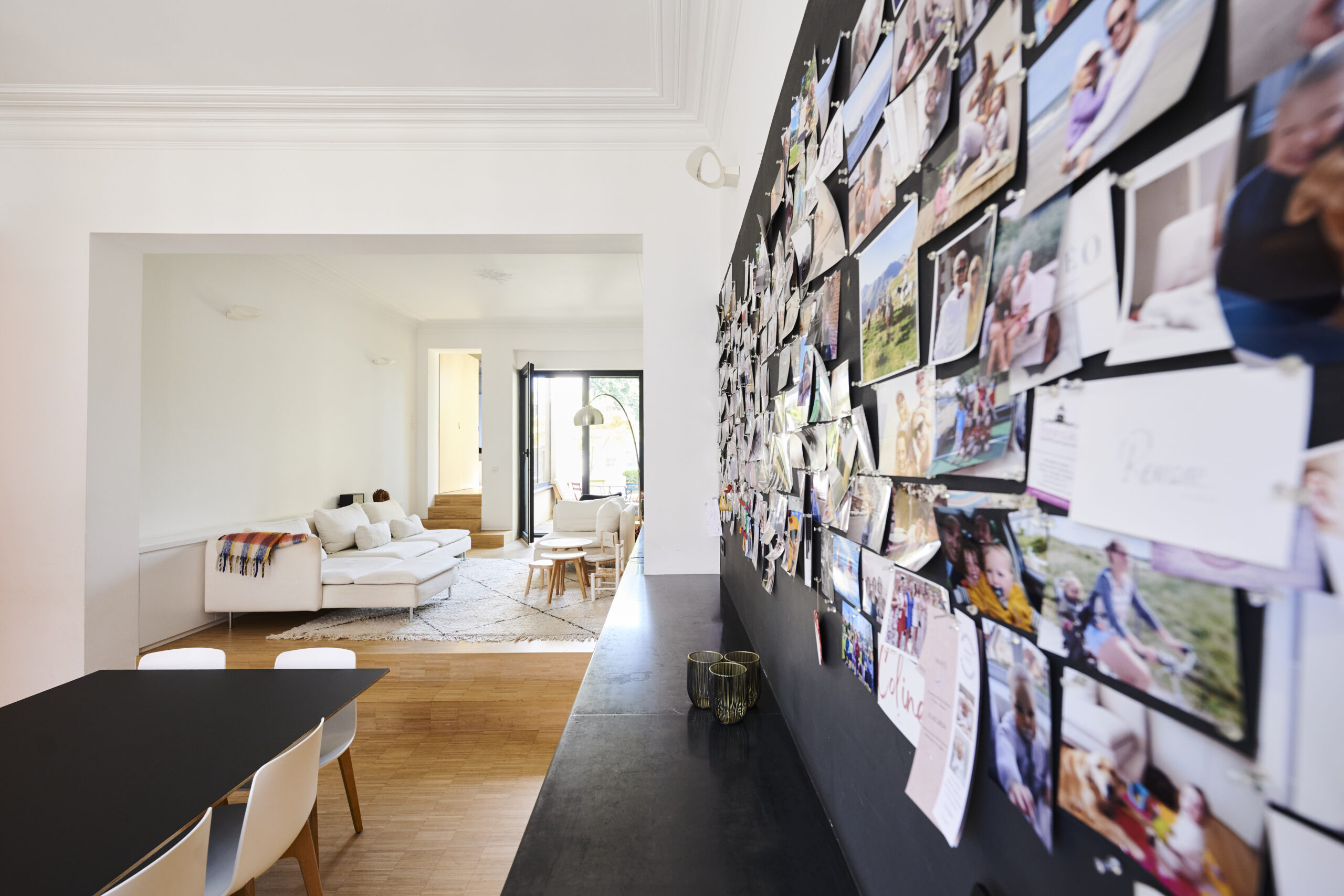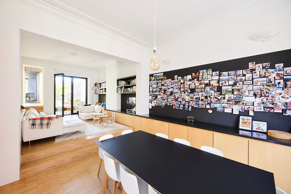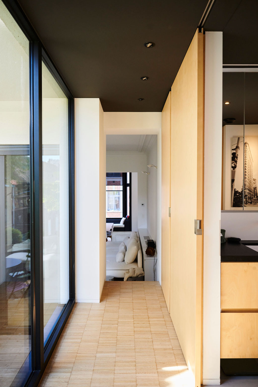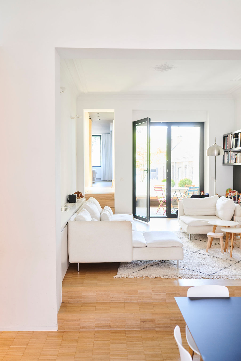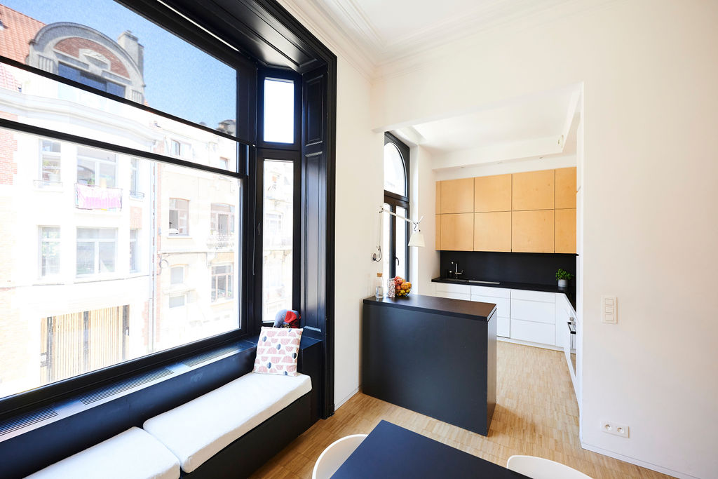 The architectural approach balances heritage preservation with energy efficiency. The street-facing façade is retained, with new double-glazed wooden windows, while the rear façade is insulated and redesigned with a more harmonious arrangement of openings. The roof is preserved and renovated, incorporating skylights and enlarged dormer windows to maximize natural light.