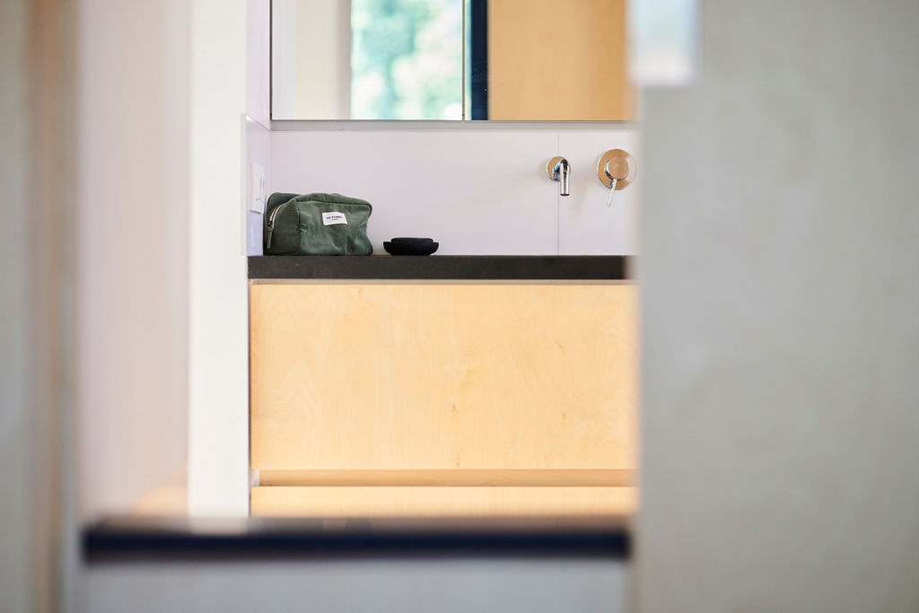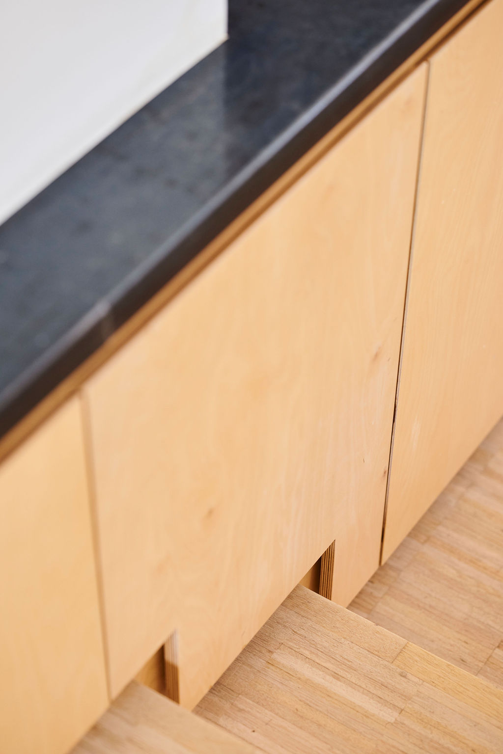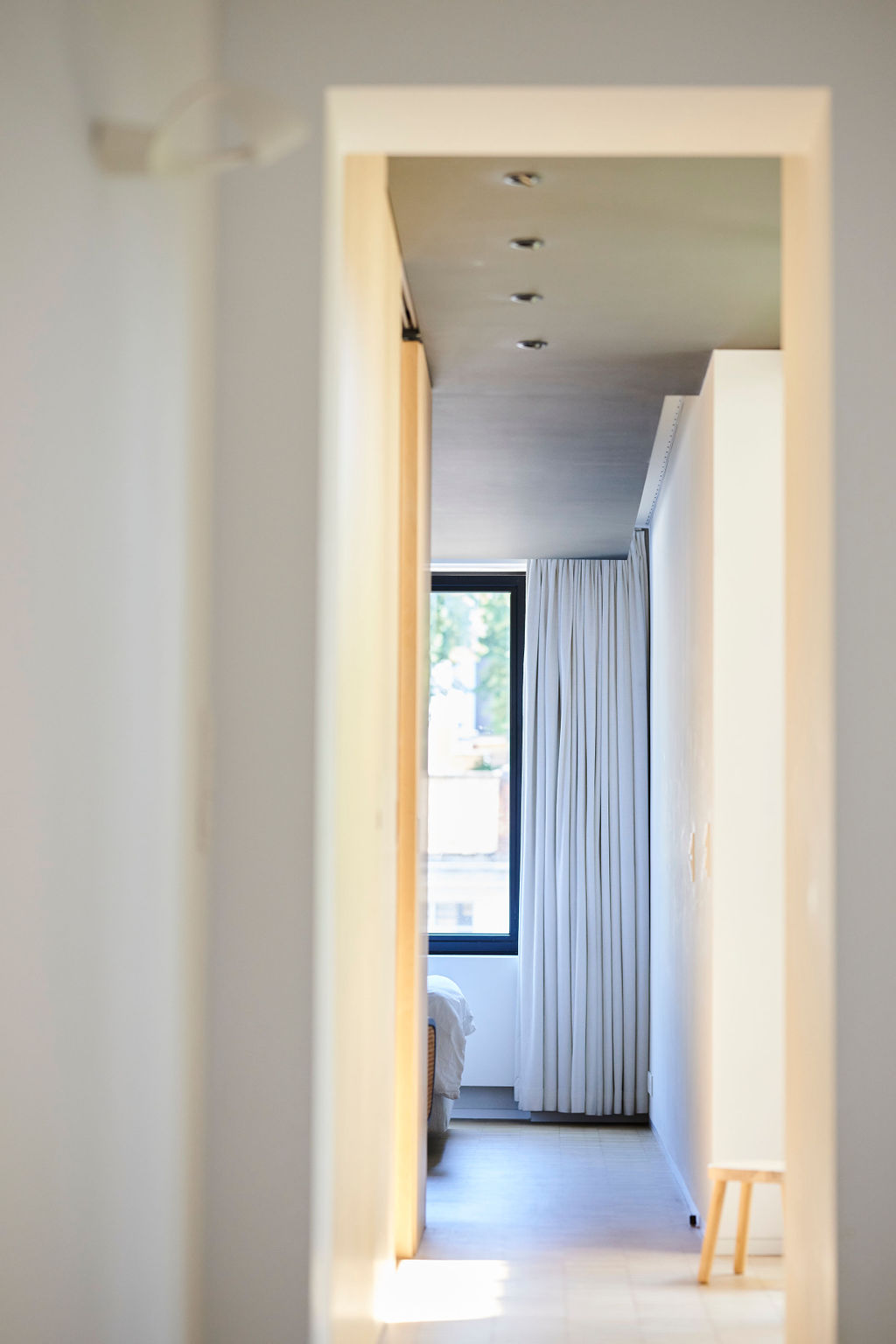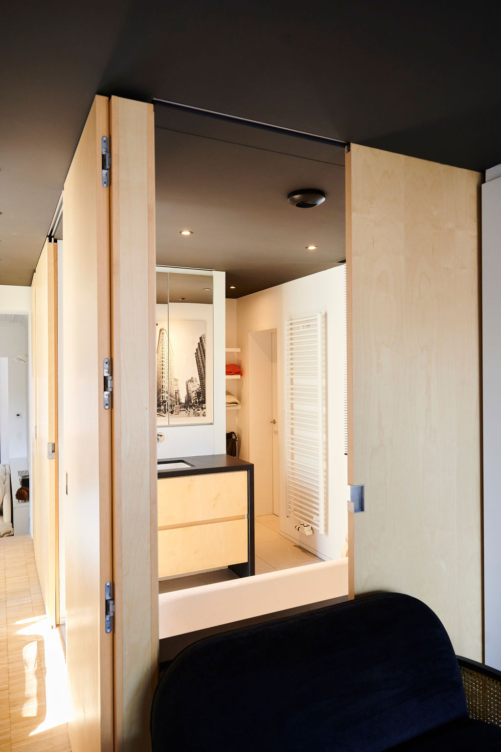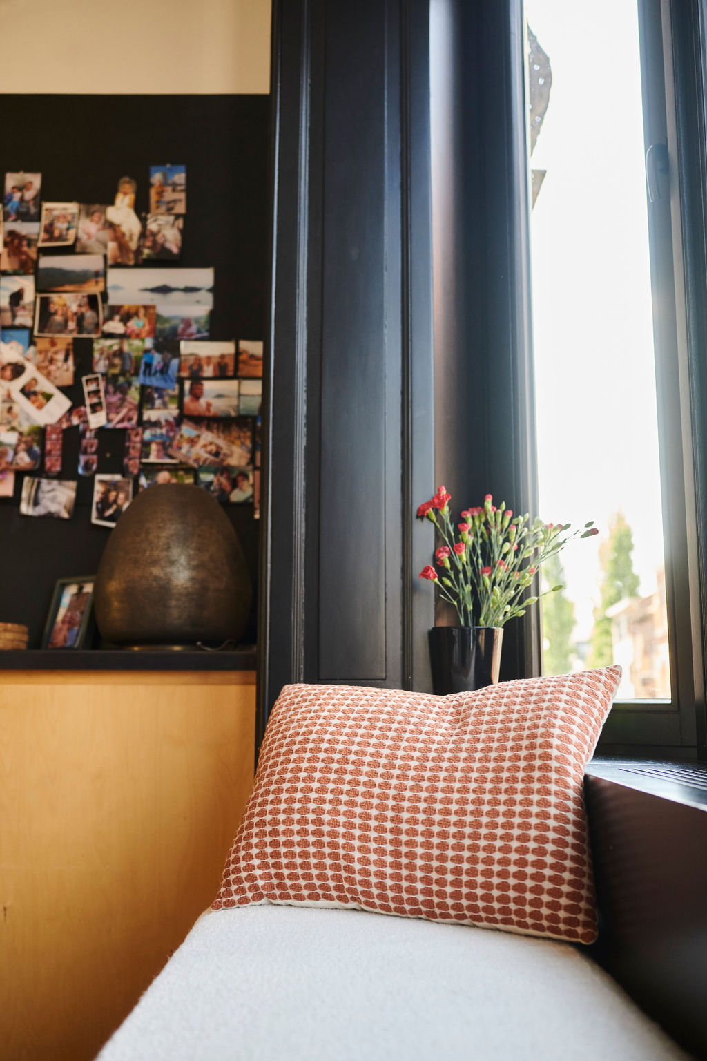 The architectural approach balances heritage preservation with energy efficiency. The street-facing façade is retained, with new double-glazed wooden windows, while the rear façade is insulated and redesigned with a more harmonious arrangement of openings. The roof is preserved and renovated, incorporating skylights and enlarged dormer windows to maximize natural light.