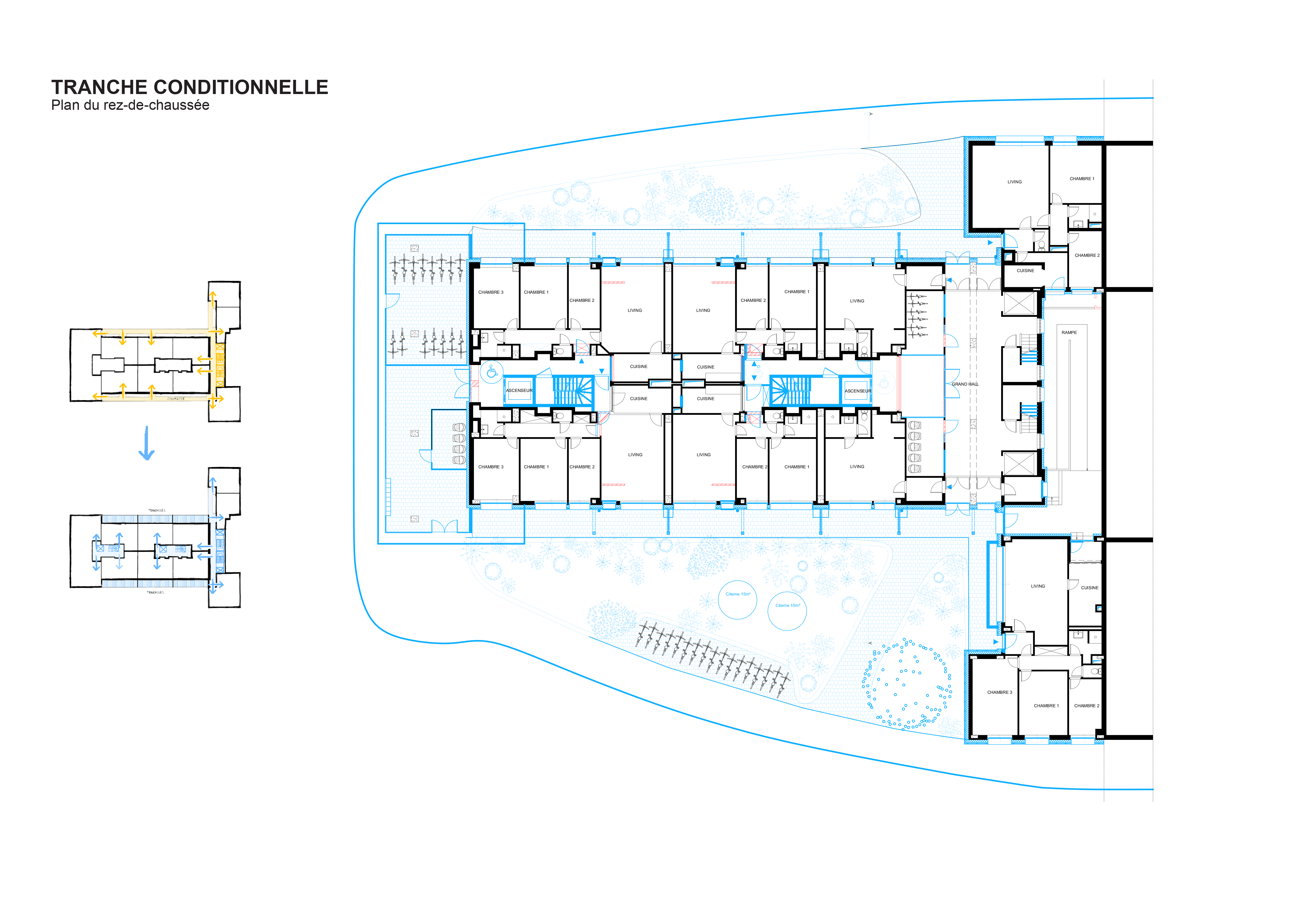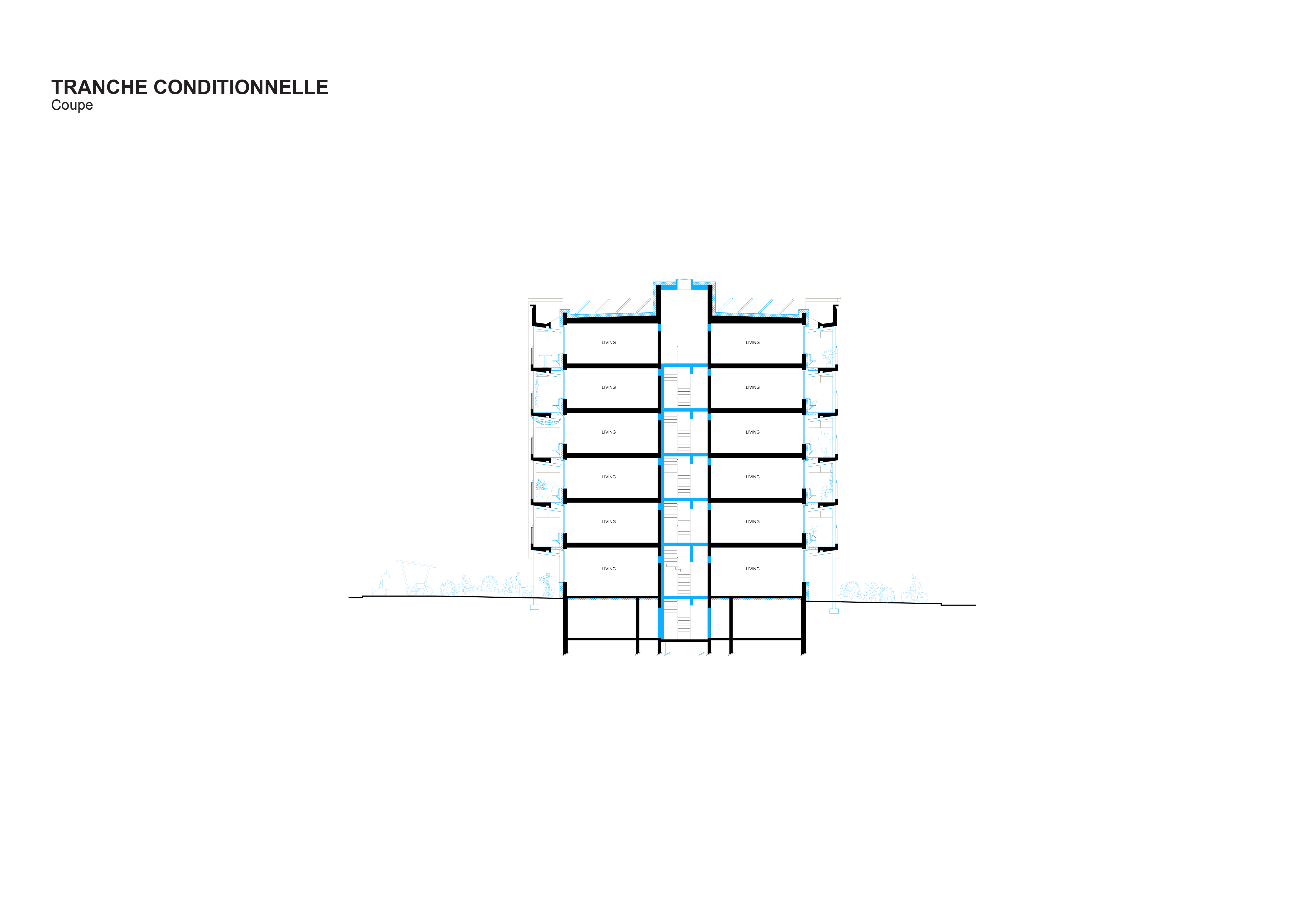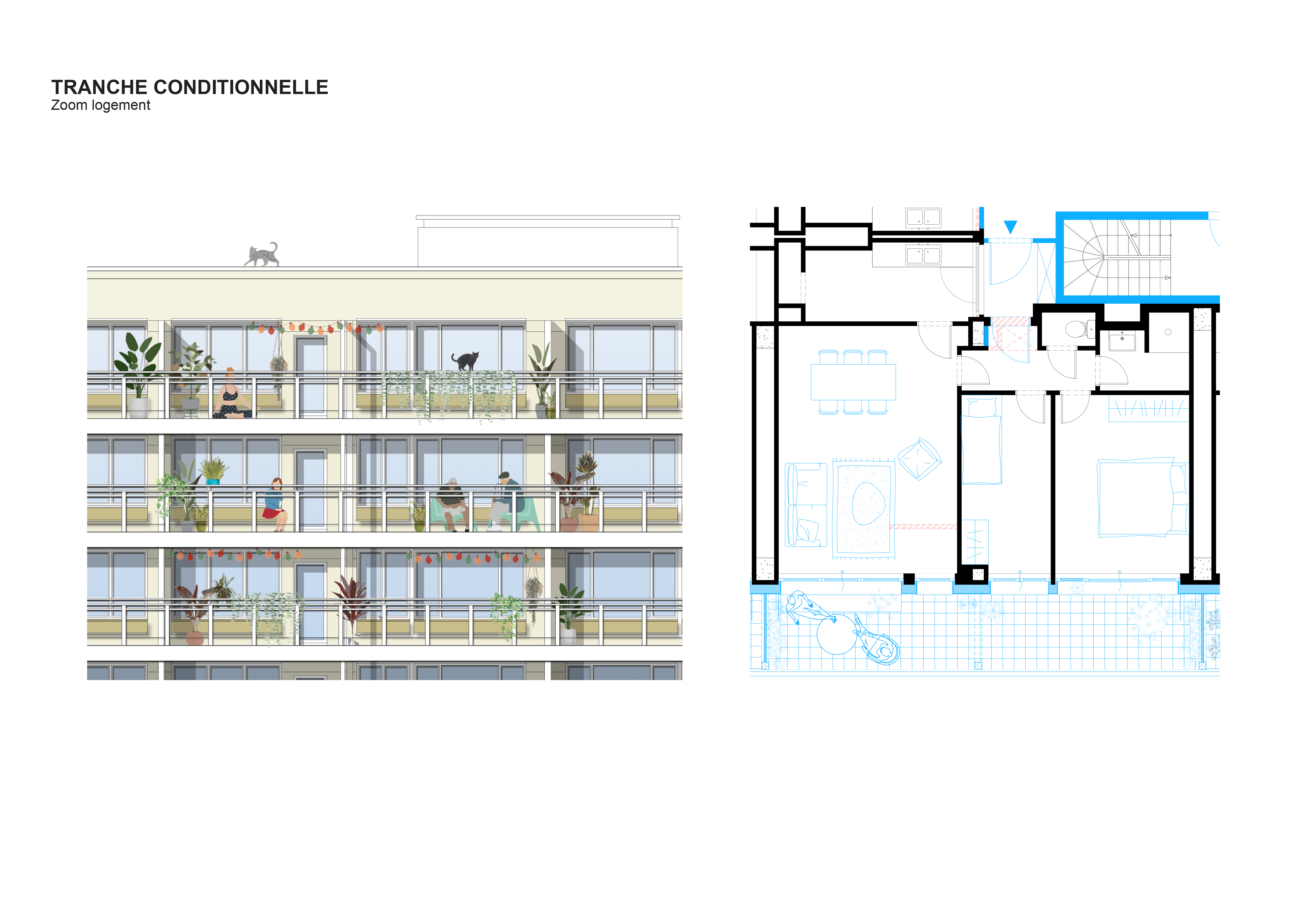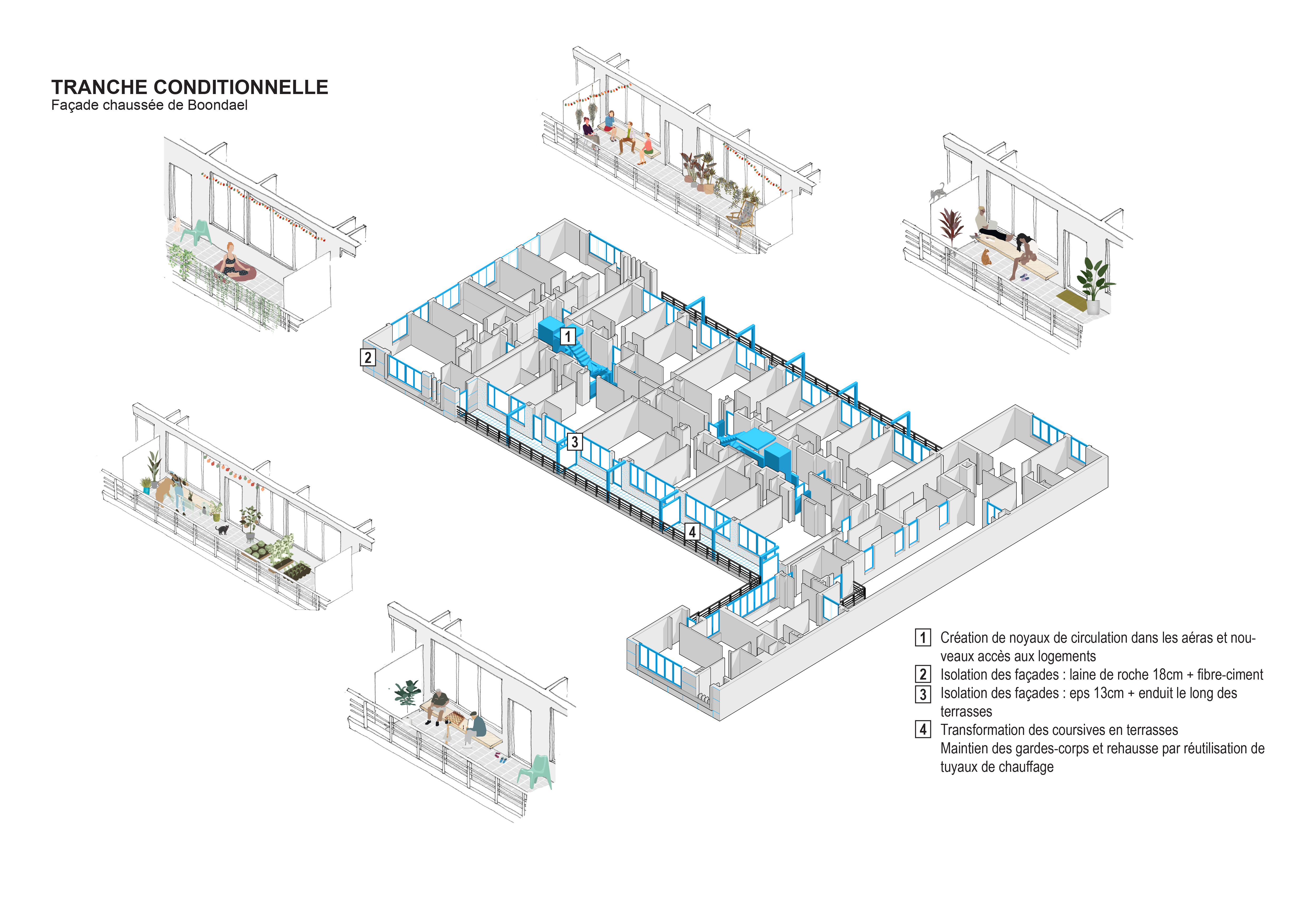 The project reorganizes the spaces by clarifying the distinction between private, communal, and collective areas. It plans the creation of circulation cores within the existing voids, allowing for the transformation of the corridors into private terraces. This reorganization seeks to enhance the use of urban spaces and improve resident comfort.